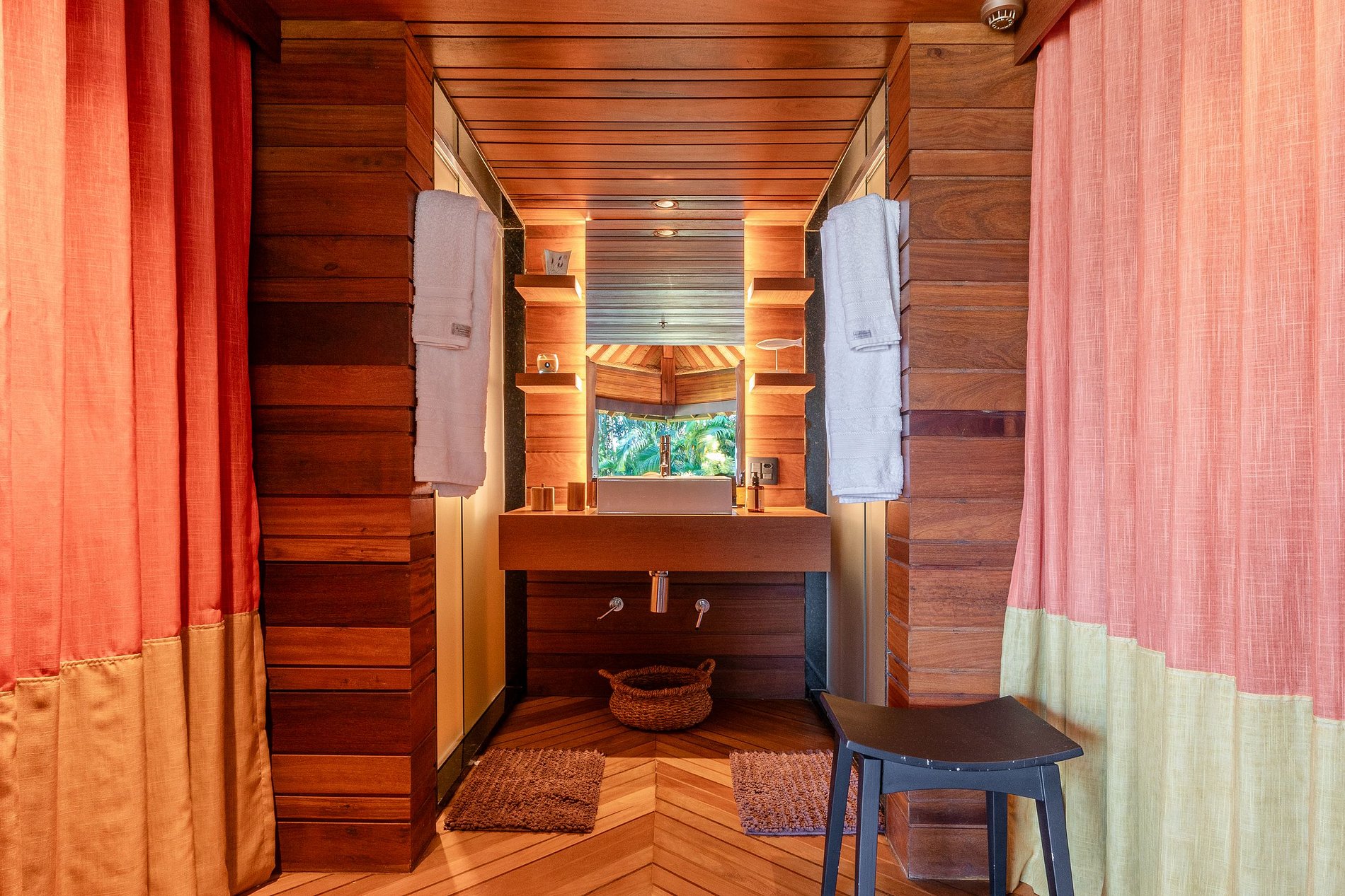 A vista aérea já desperta curiosidade, um telhado inteiro em formato de folha de palmeira no meio de um terreno privilegiado à beira mar. Saindo das águas cristalinas e serenas do mar de Angra que banha o condomínio da Mombaça, bastam alguns passos para o fascínio e encantamento tomarem conta.