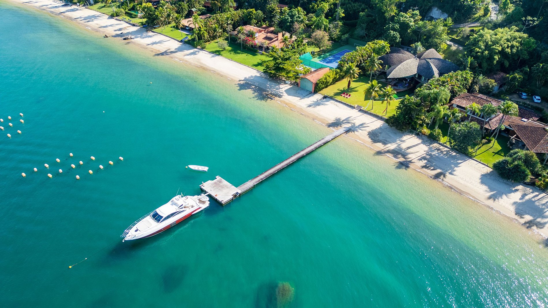 Os espaços de convivência estão no centro da casa, integrando os ambiente interno e externo e promovendo uma atmosfera harmoniosa entre os que aqui confraternizam e a natureza. Em frente à casa há um píer privado que dá acesso ao iate da casa, onde um comandante e um marinheiro se encontram à disposição.