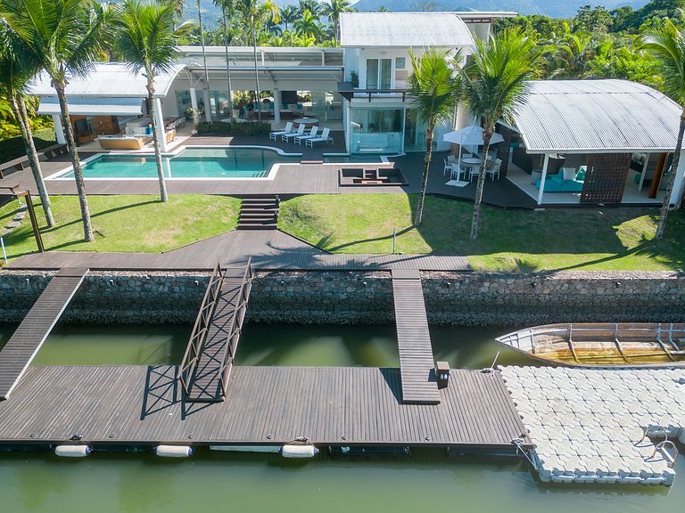 A villa dispõe de uma confortável sala de estar, com sistema de som, mesa para jantar e amplas portas de vidro, que proporcionam uma agradável vista para a da piscina e o cais; Com 7 suítes climatizadas, este paraíso acomoda até 16 pessoas e ofereçe em todos os quartos uma bela vista da região.