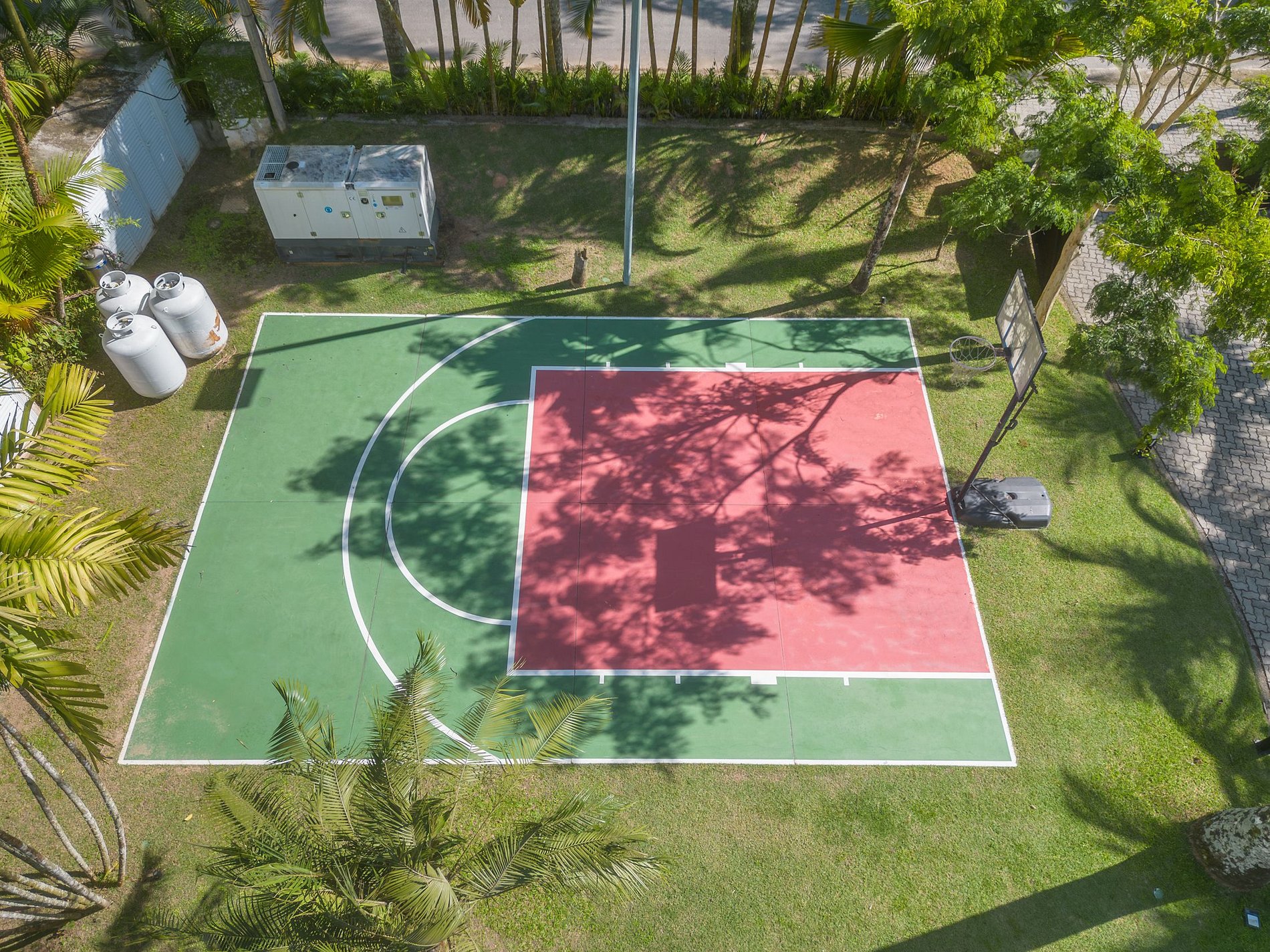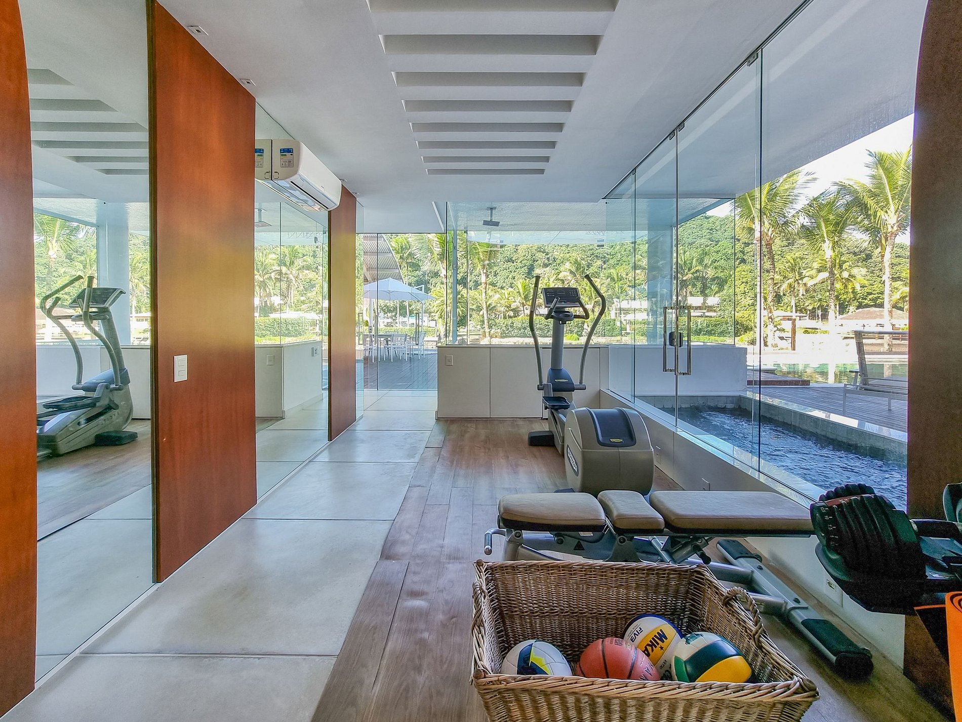 Para se exercitar temos uma pequena quadra de basquete, área para vôlei de praia e uma ampla piscina com deck em madeira. A piscina possui um lado raso próprio para para crianças e área funda, perfeita para natação e prática de esportes aquáticos, além de espaço com espreguicadeiras para aproveitar o sol. A sauna e a sala de massagem são o bônus desta casa, que conta toda a esturuta para uma estada relaxante.