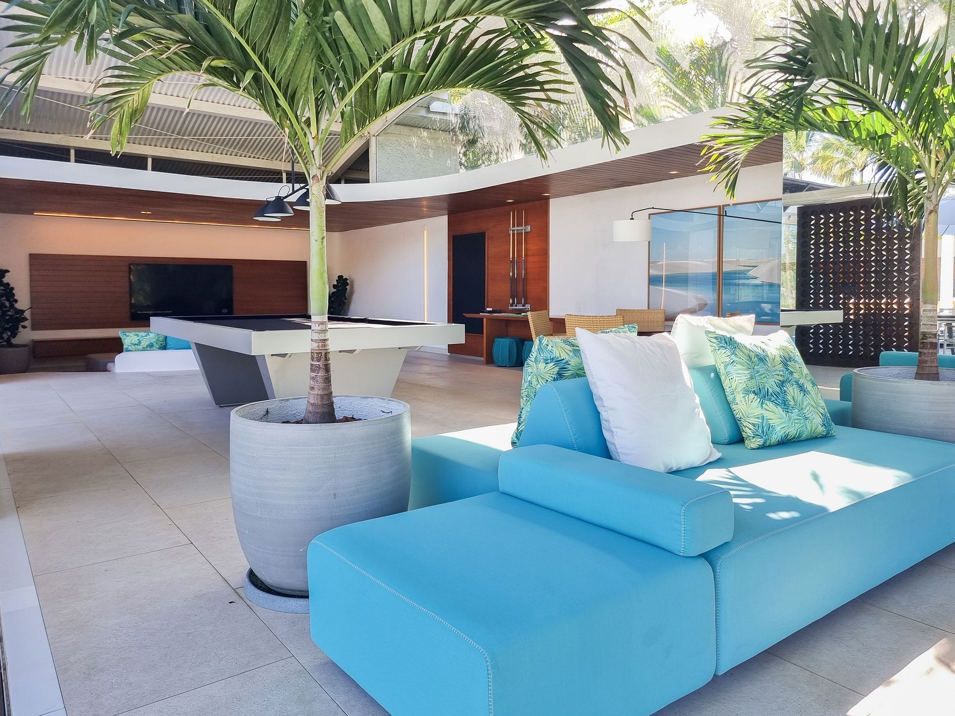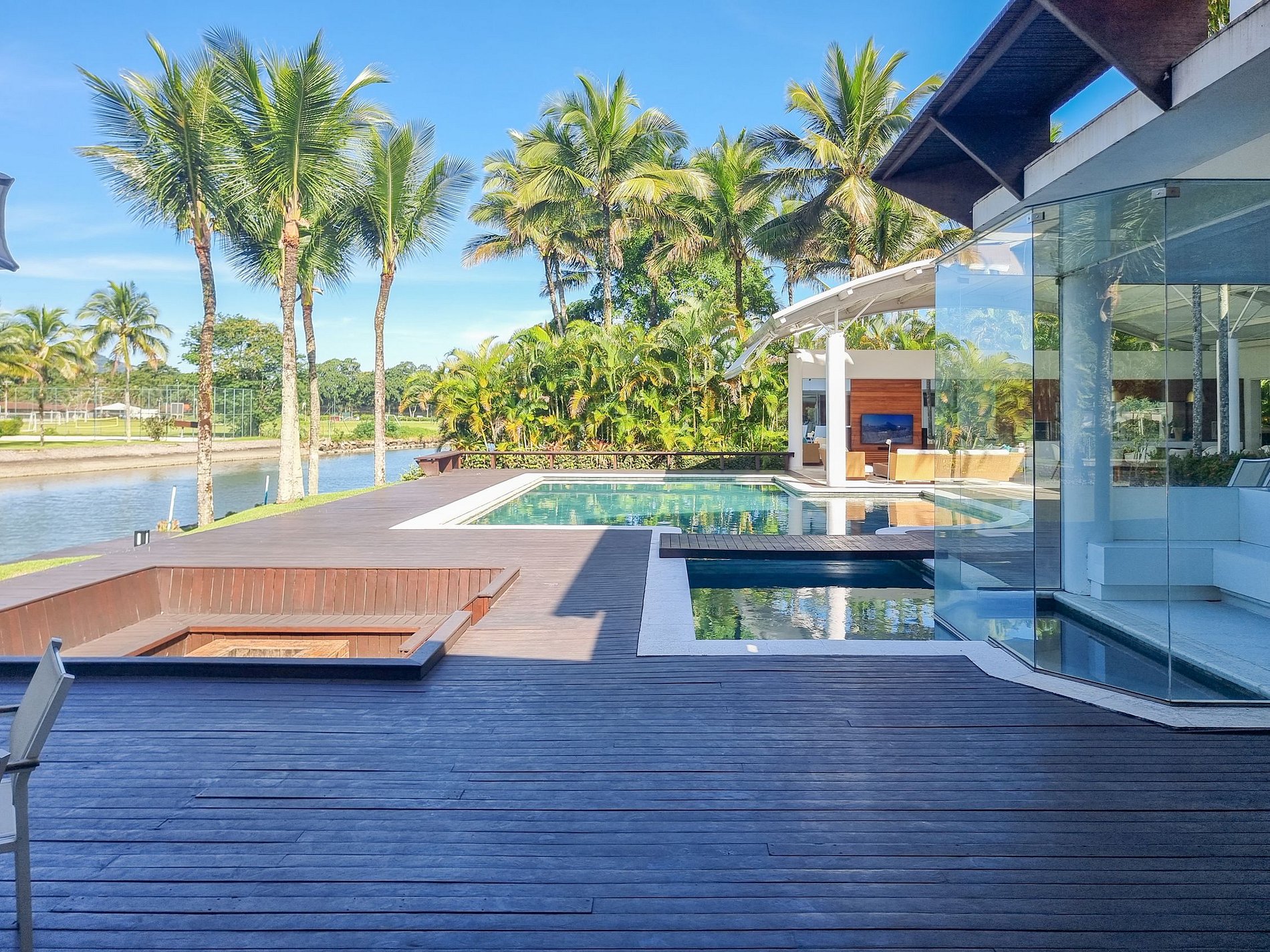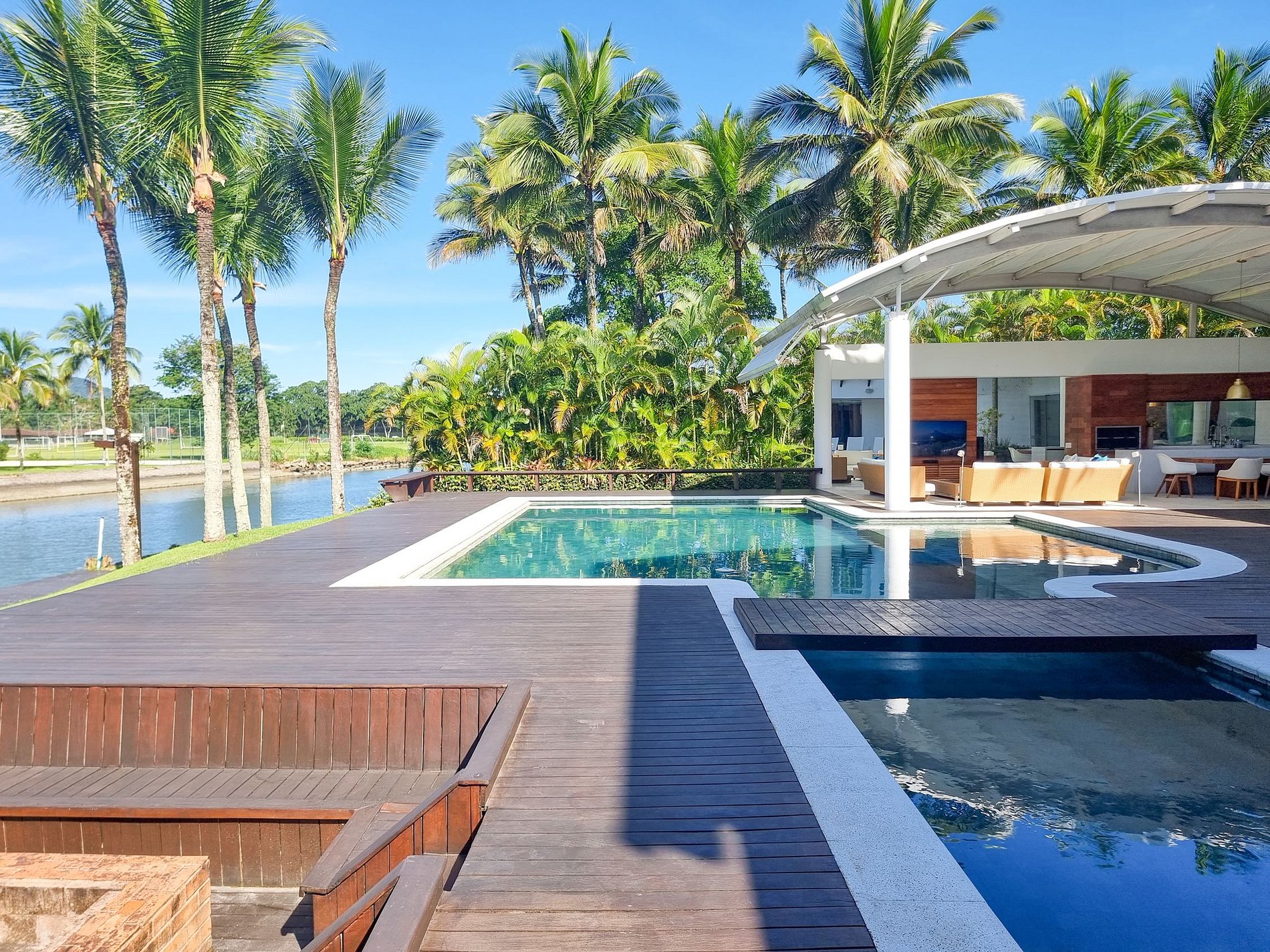 A villa dispõe de uma confortável sala de estar, com sistema de som, mesa para jantar e amplas portas de vidro, que proporcionam uma agradável vista para a da piscina e o cais; Com 7 suítes climatizadas, este paraíso acomoda até 16 pessoas e ofereçe em todos os quartos uma bela vista da região.