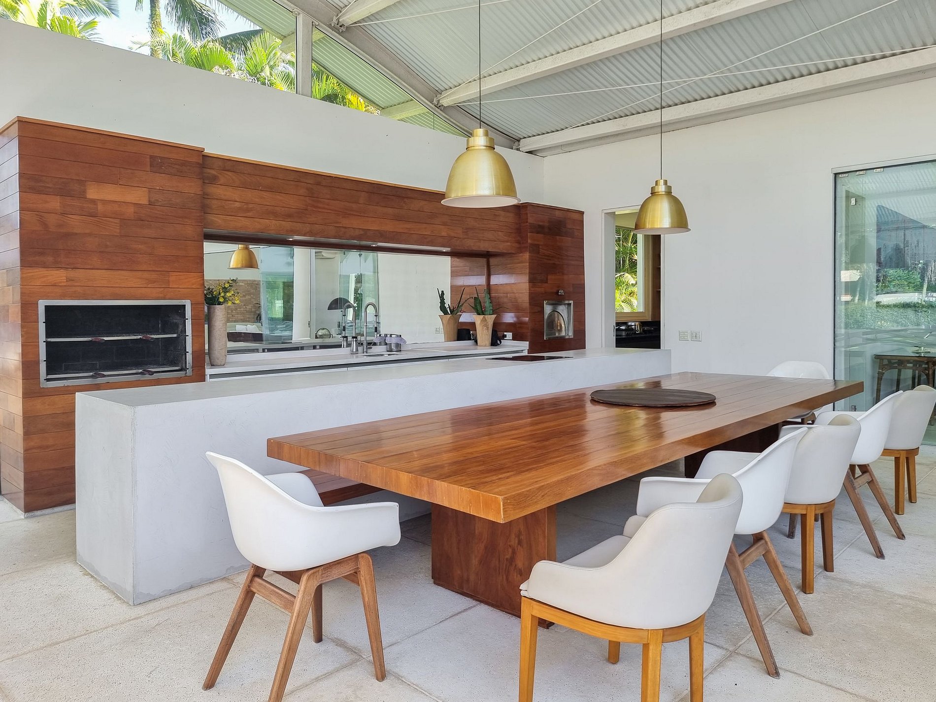A cozinha externa está equipada o necerrário para fazer um churrasco entre amigos e familiares.Já a cozinha interna, com 2 geladeiras e dispensa, dispõe da estrutura ideal para cozinhar como um chefe gourmet. A casa ainda conta com 1 área de lavanderia, com máquina de lavar e de secar e com 6 vagas cobertas para carros.