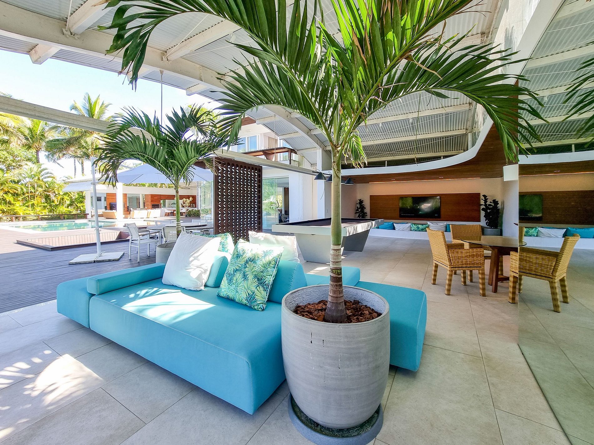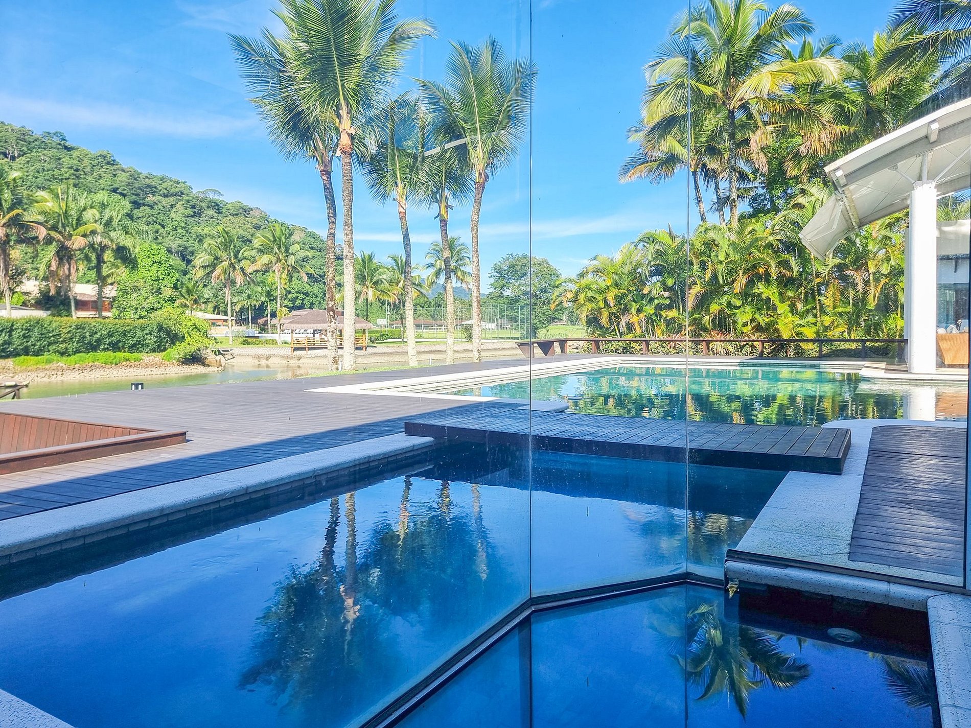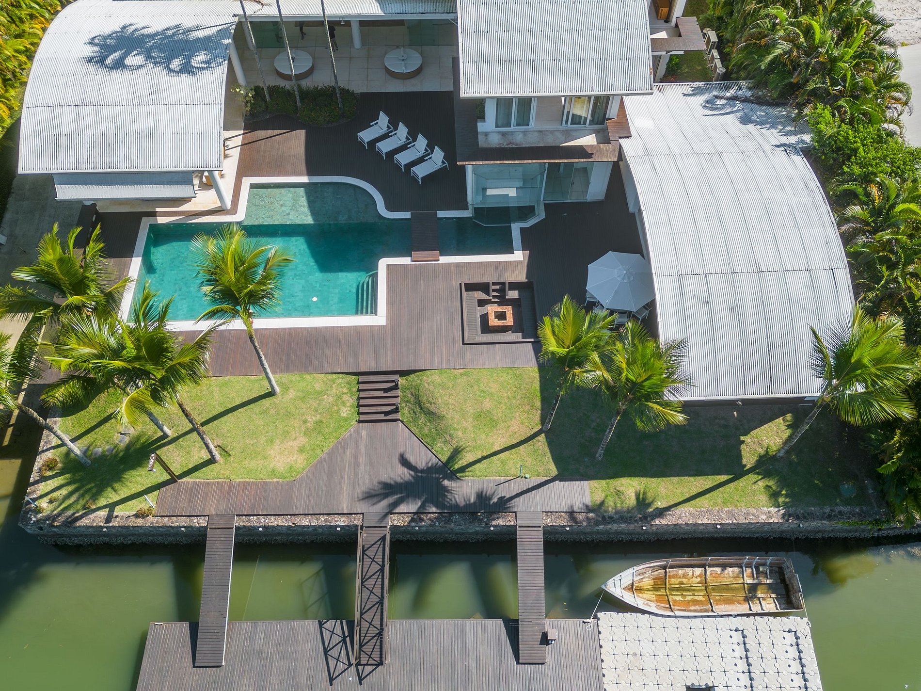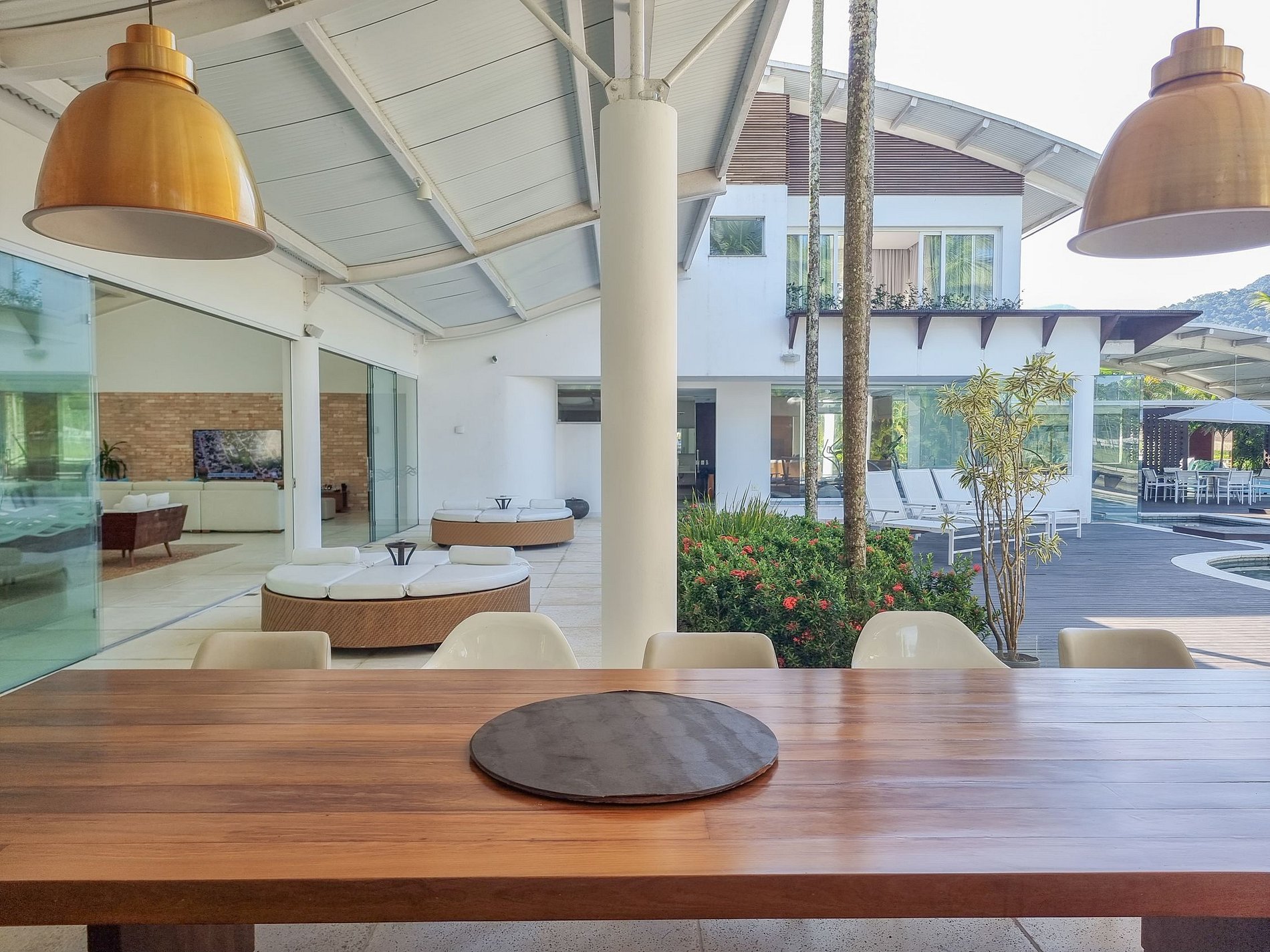 A villa dispõe de uma confortável sala de estar, com sistema de som, mesa para jantar e amplas portas de vidro, que proporcionam uma agradável vista para a da piscina e o cais; Com 7 suítes climatizadas, este paraíso acomoda até 16 pessoas e ofereçe em todos os quartos uma bela vista da região.