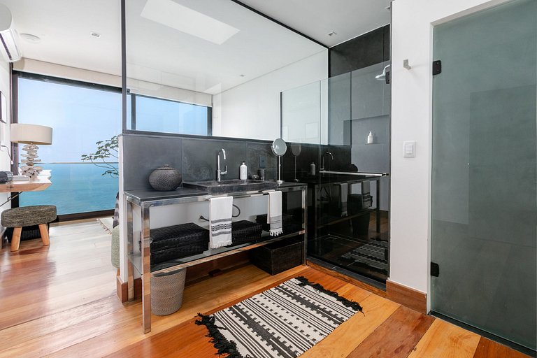 Aprecie a brisa fresca do mar no amplo terraço que se estende por toda a extensão da mansão. Aqui, encontra uma piscina linear de borda infinita que promete proporcionar horas infindáveis de relaxamento e rejuvenescimento. Cercado por assentos confortáveis e uma fogueira moderna, este é o lugar perfeito para socializar e absorver a beleza do ambiente.