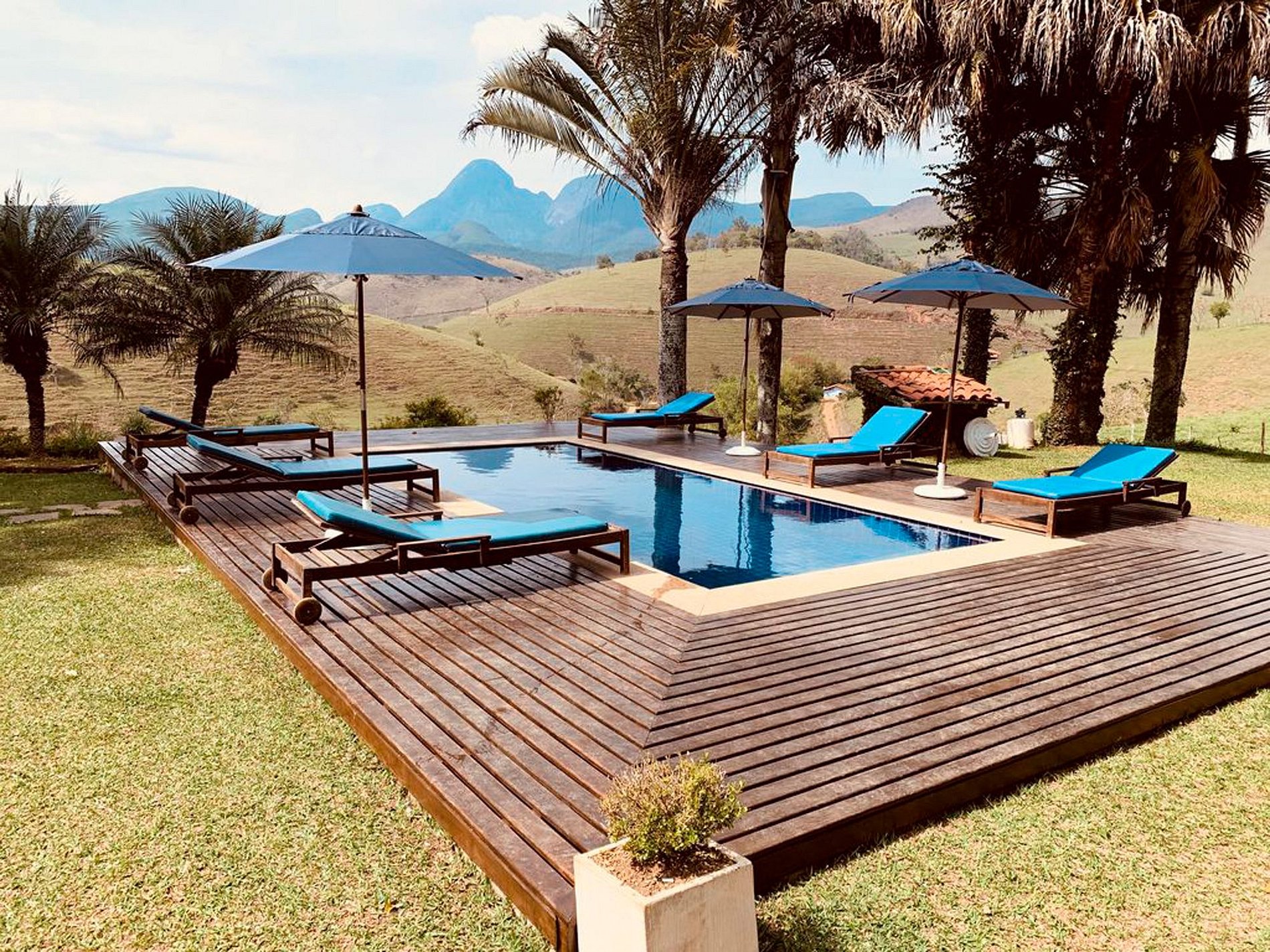 Desfrute de vistas deslumbrantes na piscina, com seis espreguiçadeiras e três guarda-sóis.