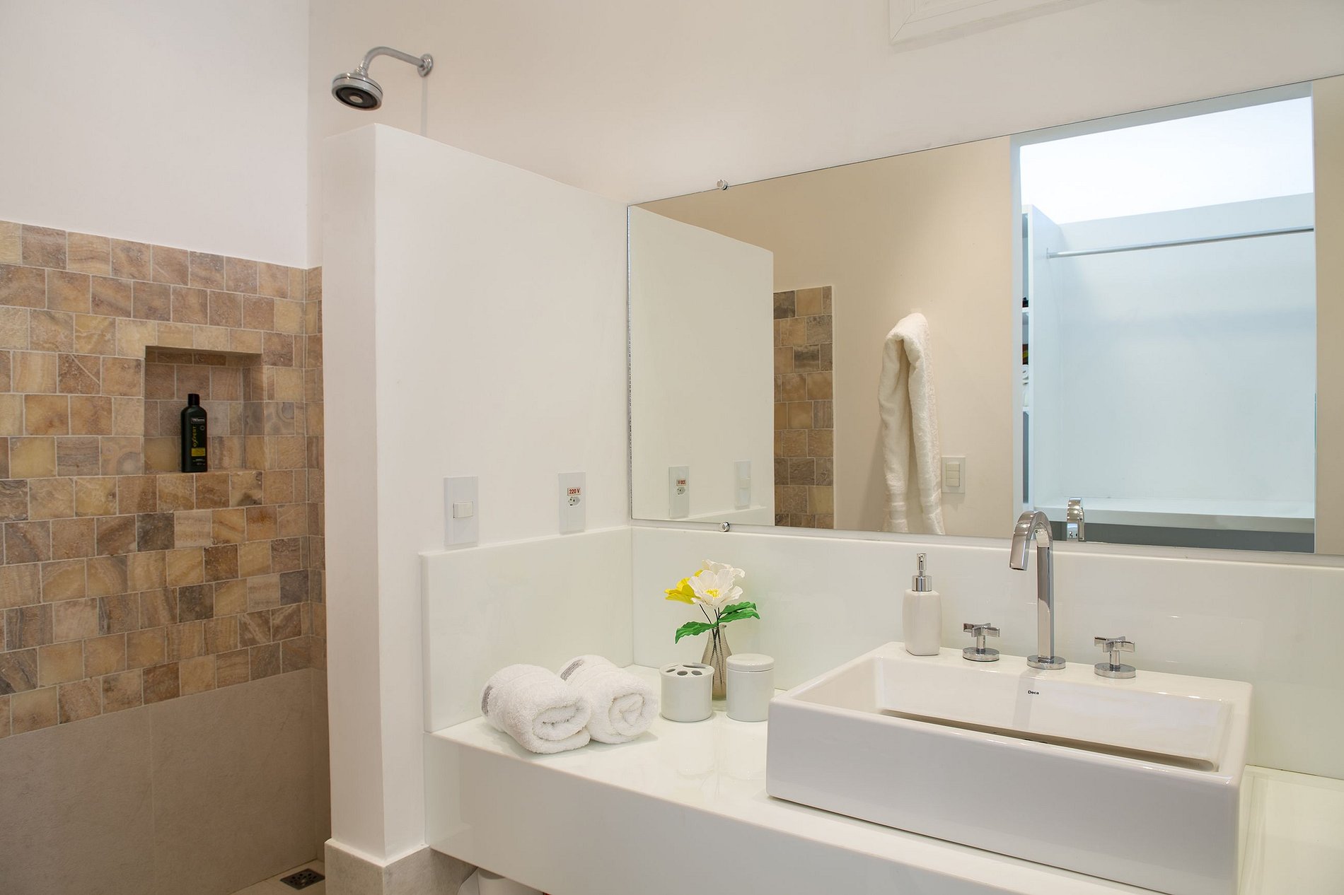 Além de tudo, em seu exterior, há duas piscinas, uma com borda infinita e outra em estilo espelho d'água. Há também uma ampla sauna seca envidraçada com vista para a mata, sala de massagem com frigobar, banheiro, duchas e uma área de descanso bem baiana com duas redes. Para quem não dispensa se manter ativo, também há equipamentos de ginástica ao ar livre disponíveis.