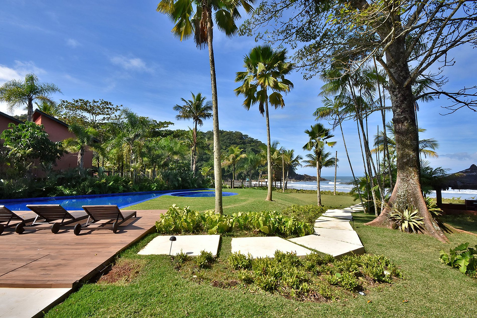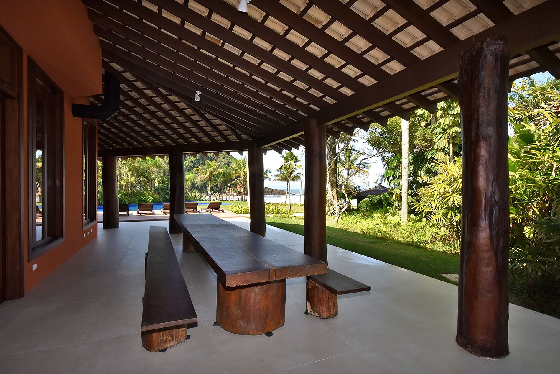 Além da vista encantadora, os hóspedes aqui podem desfrutar tanto da piscina situada no amplo jardim quanto da praia, pois a casa dispõe de uma tenda, dois guarda-sóis e 14 espreguiçadeiras. Entre um mergulho e outro, um churrasco ou um bom momento de relaxamento no spa da propriedade, é possível utilizar a sauna mediante um custo adicional (R$150,00 para um máximo de 3 horas de uso).