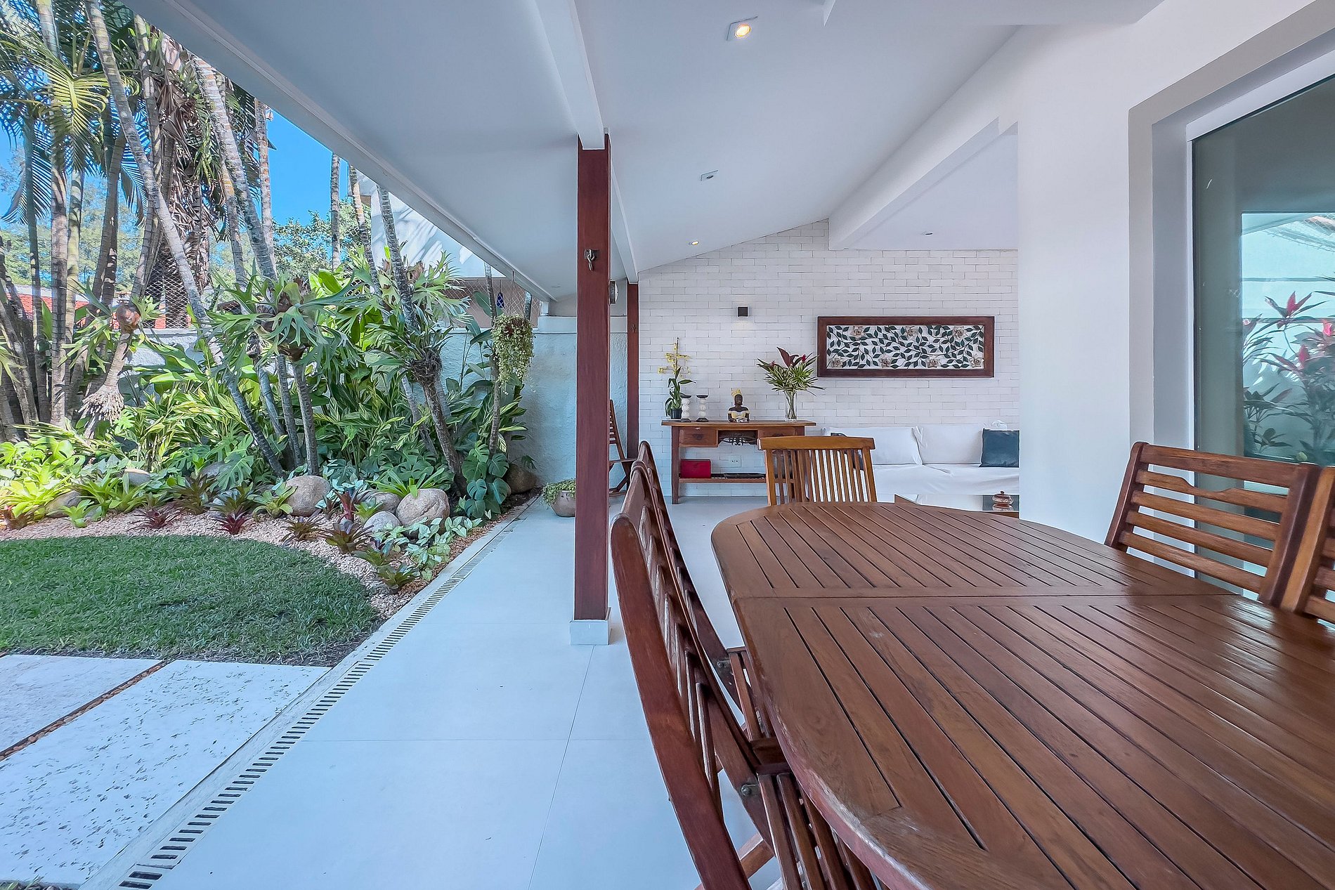 A casa é um convite ao bem-estar, com uma sala ampla e integrada à área de lazer, onde se encontra uma piscina cercada por um jardim exuberante. O espaço gourmet, coberto e equipado com churrasqueira, micro-ondas e freezer, é ideal para receber convidados. Além disso, conta com sauna, dois banheiros externos e uma varanda charmosa que oferece o cenário perfeito para refeições ao ar livre.