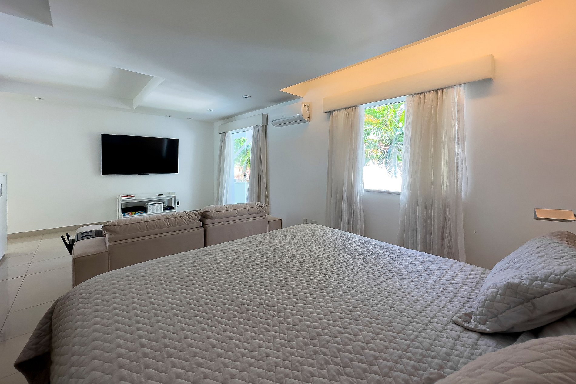 Com capacidade para acomodar até 12 pessoas, a residência possui cinco quartos confortáveis, sendo três suítes. A suíte master impressiona com uma cama super king, sofá reclinável e espaço de sobra para uma experiência de hospedagem exclusiva. Há ainda uma academia privativa, um escritório e uma mesa de pingue-pongue, garantindo comodidade e entretenimento para toda a família.