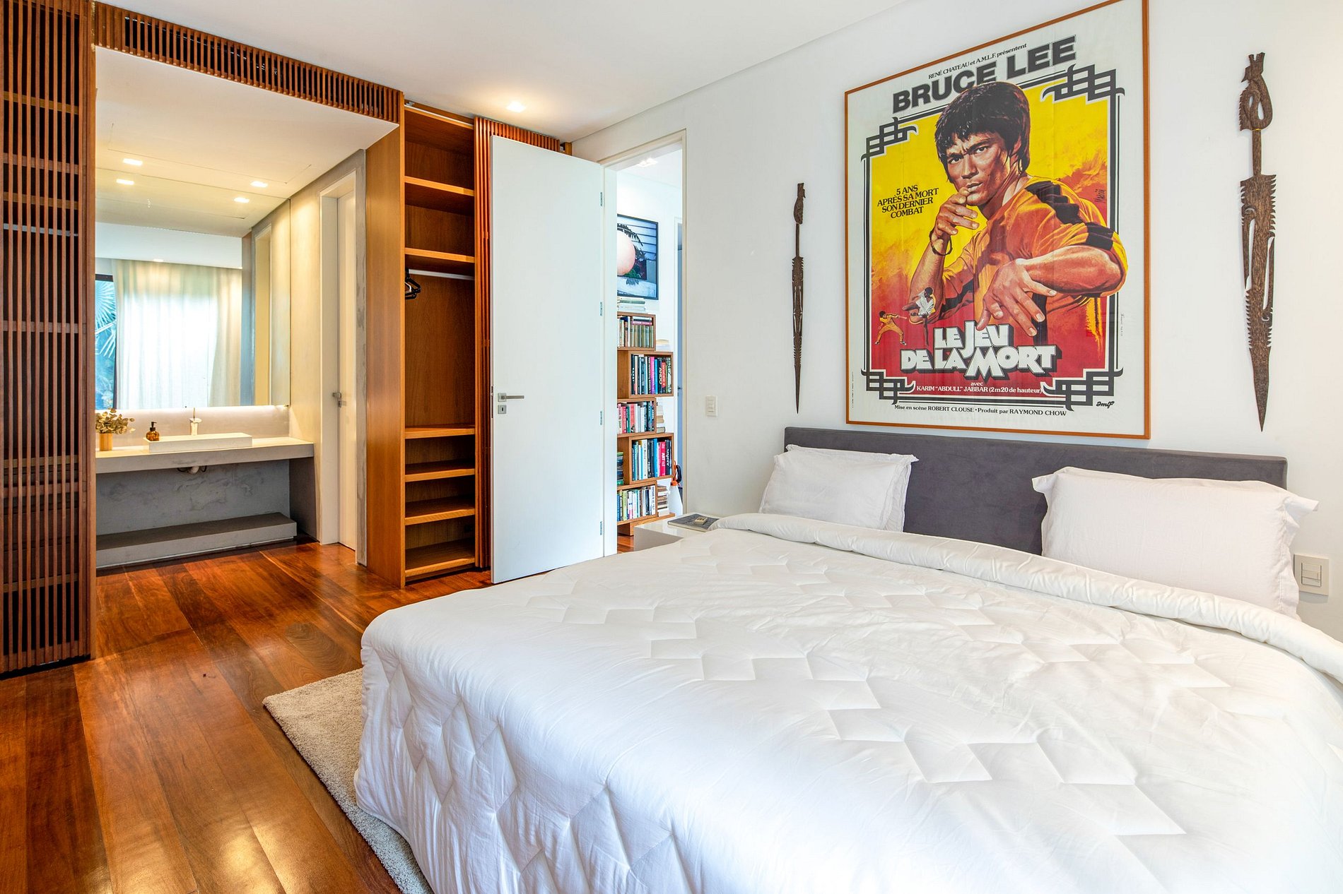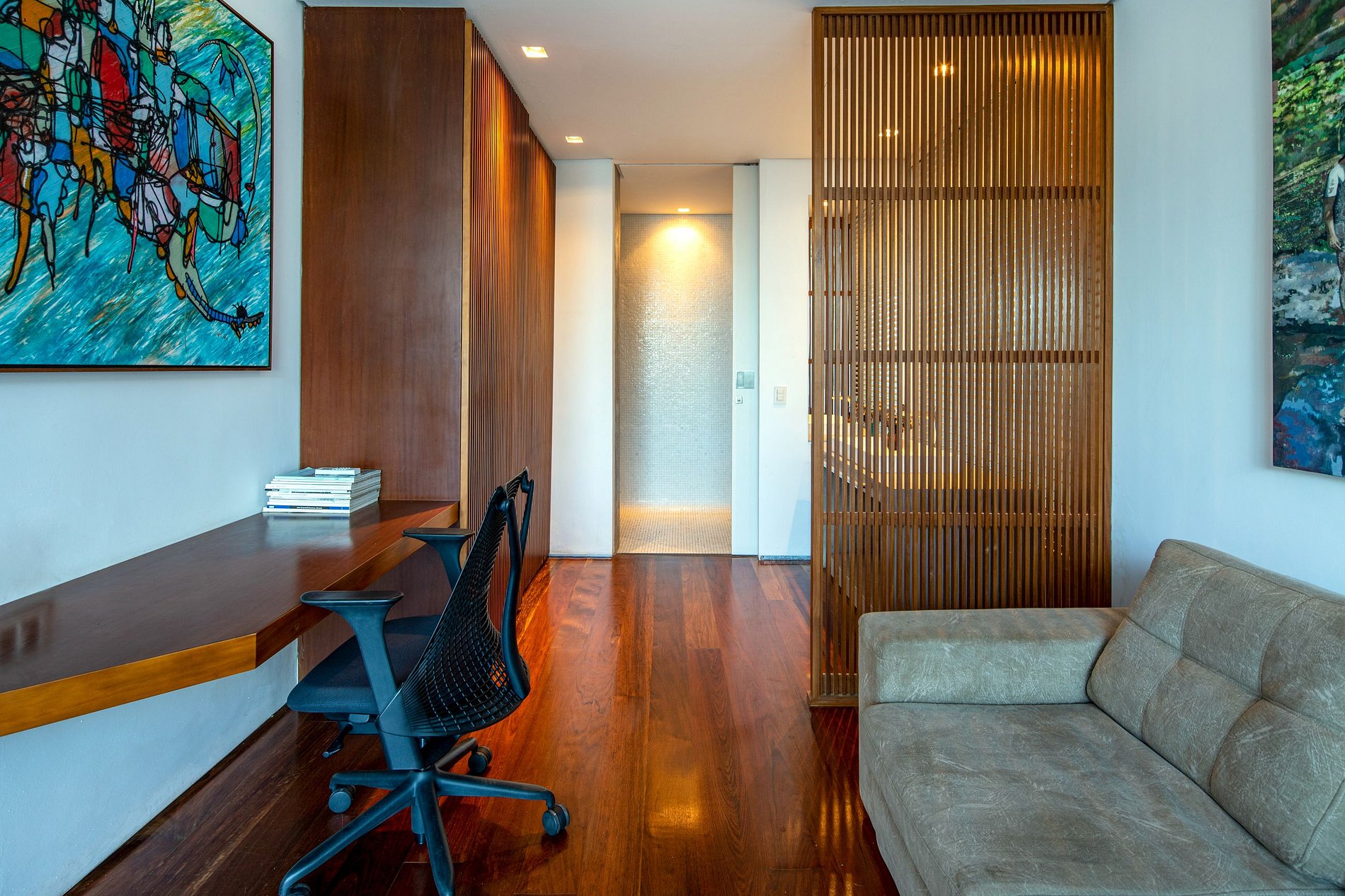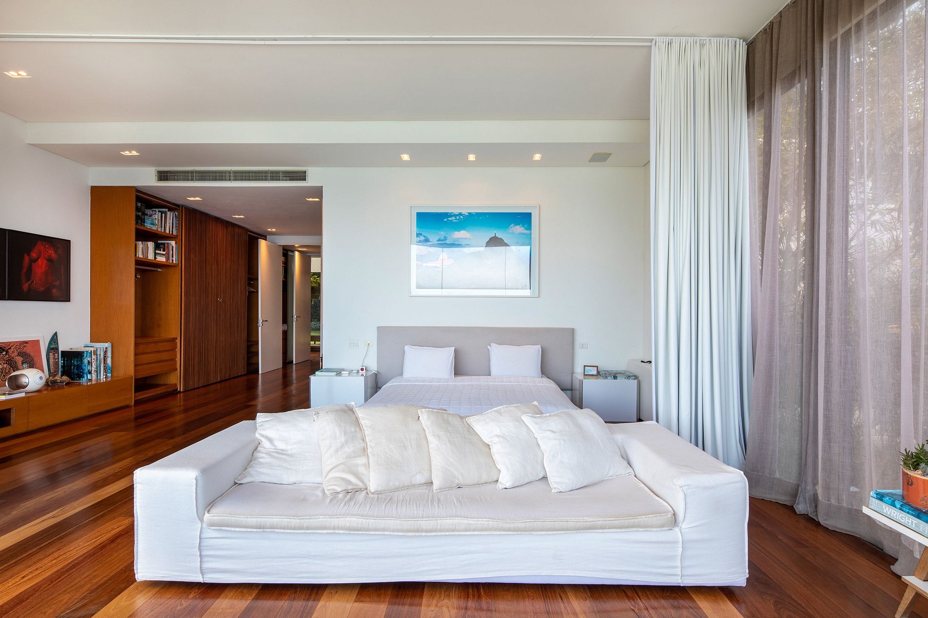 No andar de cima, você encontrará as cinco suítes, que são decoradas com o mais moderno design e conforto. Com janelas do piso ao teto de vidro, você pode desfrutar de vistas panorâmicas deslumbrantes para o oceano. A ampla sala de estar é dividida em dois níveis e conta com mesa de jantar com capacidade para 10 pessoas confortavelmente, duas salas de estar com um Futon e um enorme sofá.