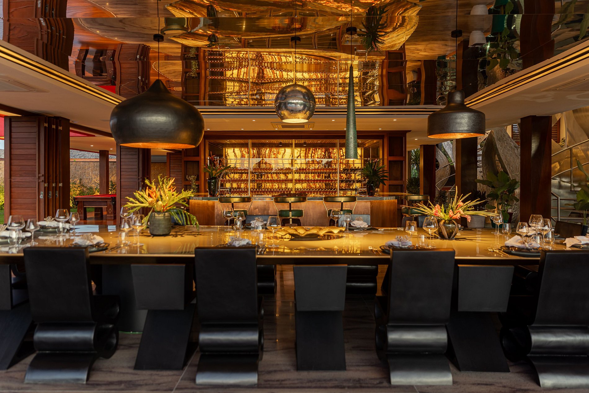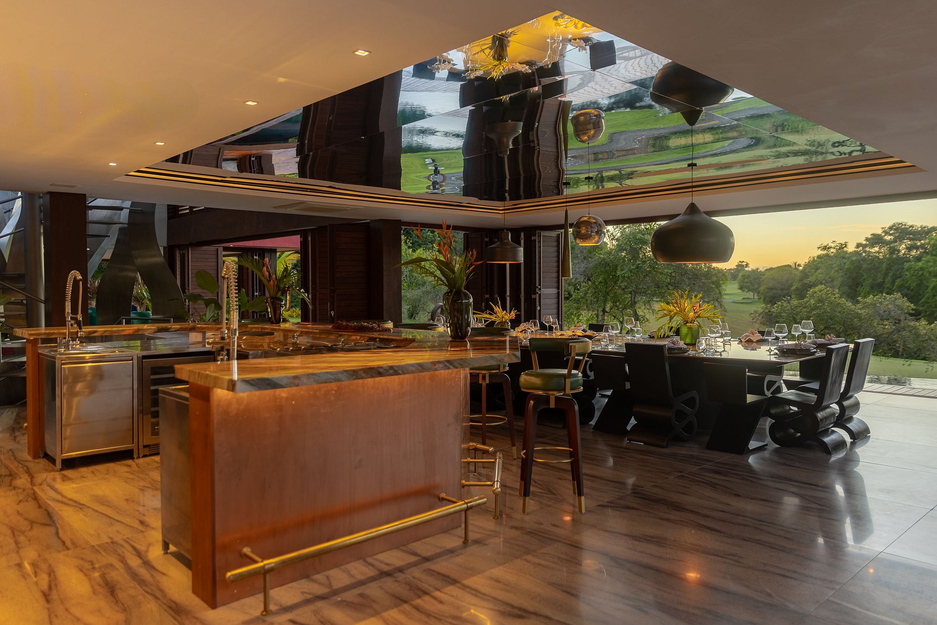 A área externa é um espetáculo à parte: uma piscina de borda infinita com 400 m² convida ao relaxamento, enquanto o Aqua Bar integrado transforma qualquer dia em uma celebração tropical. Para os momentos de entretenimento, a casa conta com cinema privativo, adega de vinhos, espaço gourmet e um Fitness & Wellness Center completo.