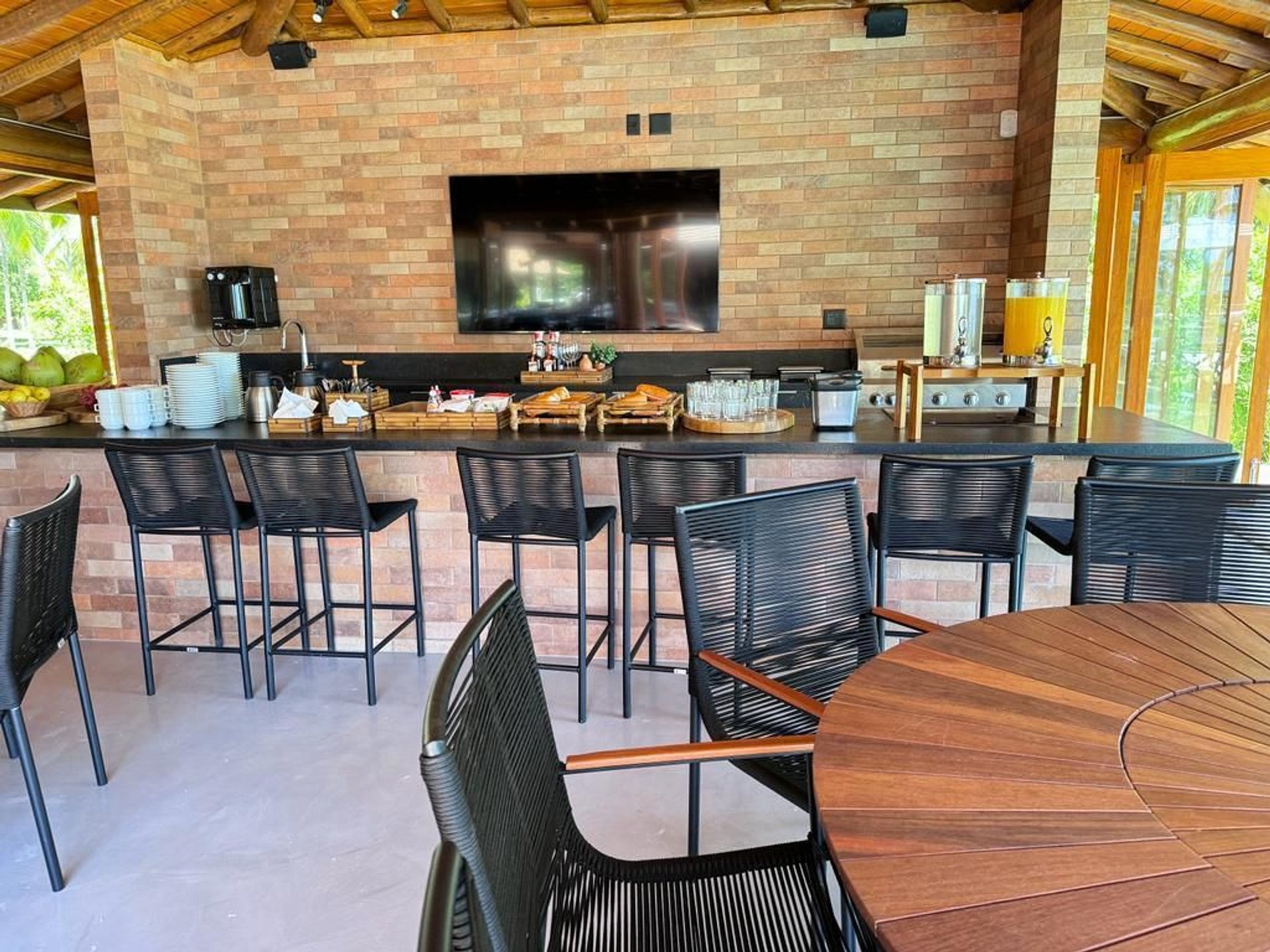 A villa impressiona com seus espaços amplos, arquitetura tropical contemporânea e acabamentos de alto padrão. São 10 suítes privativas, todas com ar-condicionado, banheiros elegantes e varandas com vista para o mar ou jardim. A integração entre os ambientes internos e externos proporciona uma experiência única de conexão com a natureza, com destaque para a área de convivência que se abre para uma piscina com borda infinita e lounge à beira-mar.