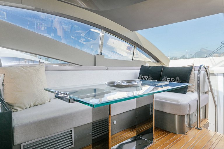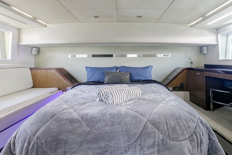 A sala de estar é espaçosa, com dois sofás confortáveis, e há armários tanto nos quartos quanto na sala para armazenamento conveniente. A lancha também é equipada com um gerador de 20 kW, proporcionando energia independente para todos os ambientes.