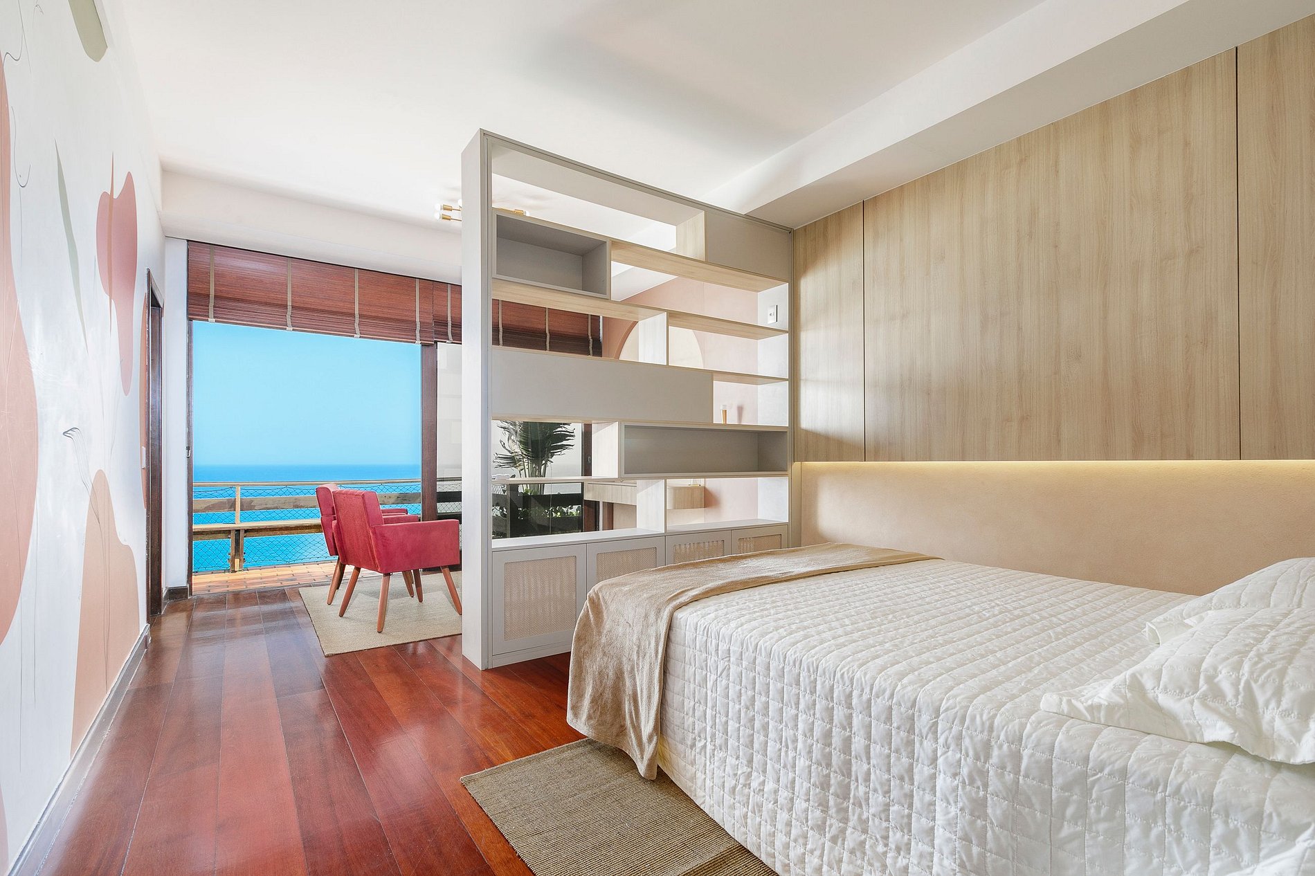 A residência conta com cinco quartos lindamente decorados, incluindo cinco amplas suítes com banheiros privativos. Com capacidade para acomodar até 10 hóspedes, cada quarto é equipado com ar-condicionado e oferece vistas deslumbrantes, garantindo uma estadia de máximo conforto e sofisticação.