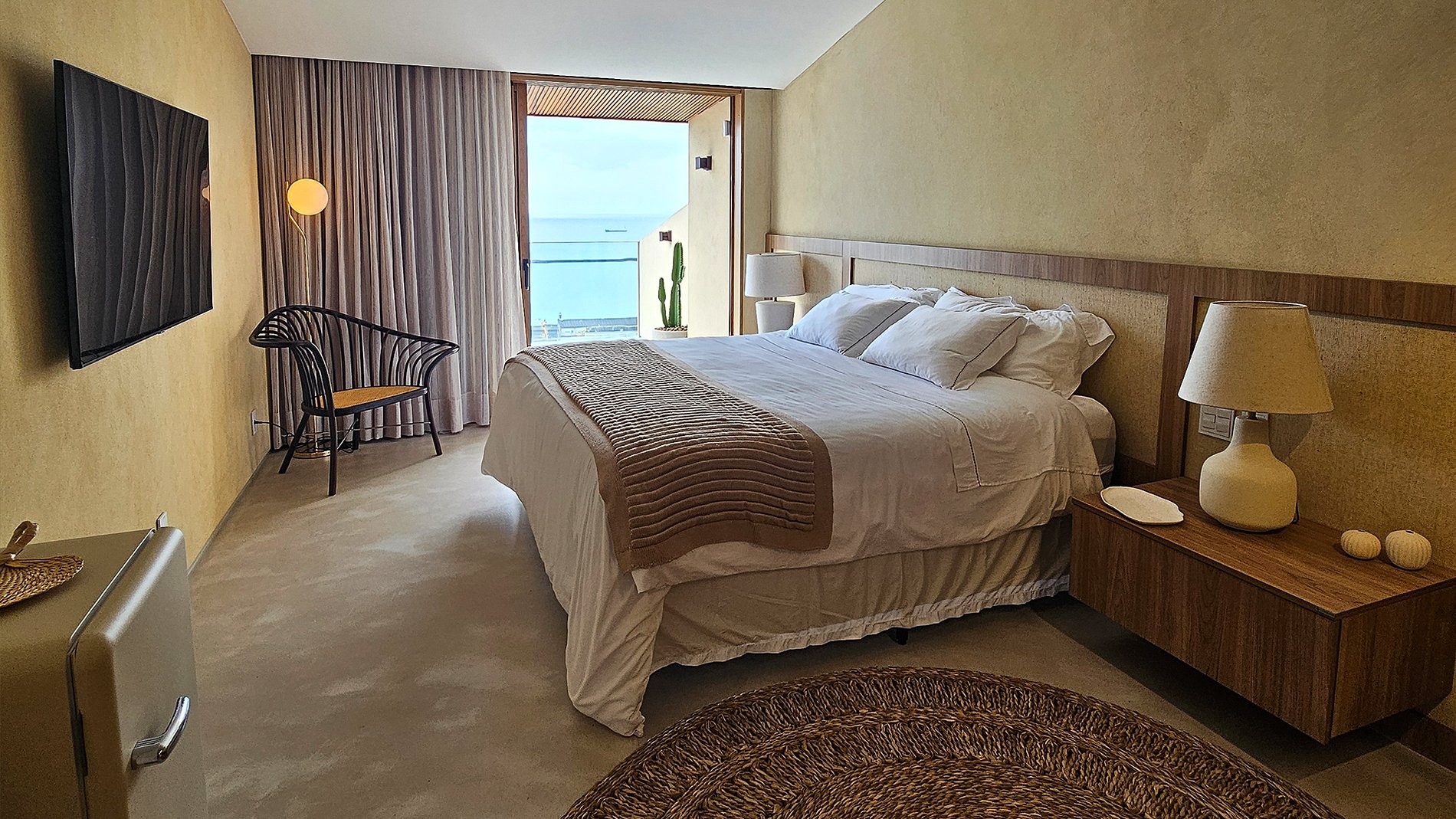 No interior, os ambientes sociais revelam um estilo contemporâneo e acolhedor. A cozinha social é totalmente equipada, perfeita para quem aprecia a arte de cozinhar com vista para o mar. A sala de jantar ampla e a sala de estar com TV tornam os momentos em grupo ainda mais prazerosos. A casa também oferece uma cozinha de serviço, lavanderia e banheiro de apoio à piscina para maior comodidade.