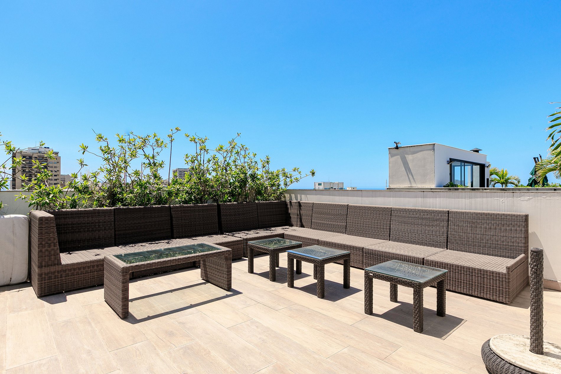 O ponto alto desta cobertura é, sem dúvida, o grande terraço que se estende diante de você, com uma piscina privativa convidativa e uma vista panorâmica simplesmente fantástica. Este é o lugar perfeito para relaxar, socializar e apreciar a beleza natural que Ipanema oferece.