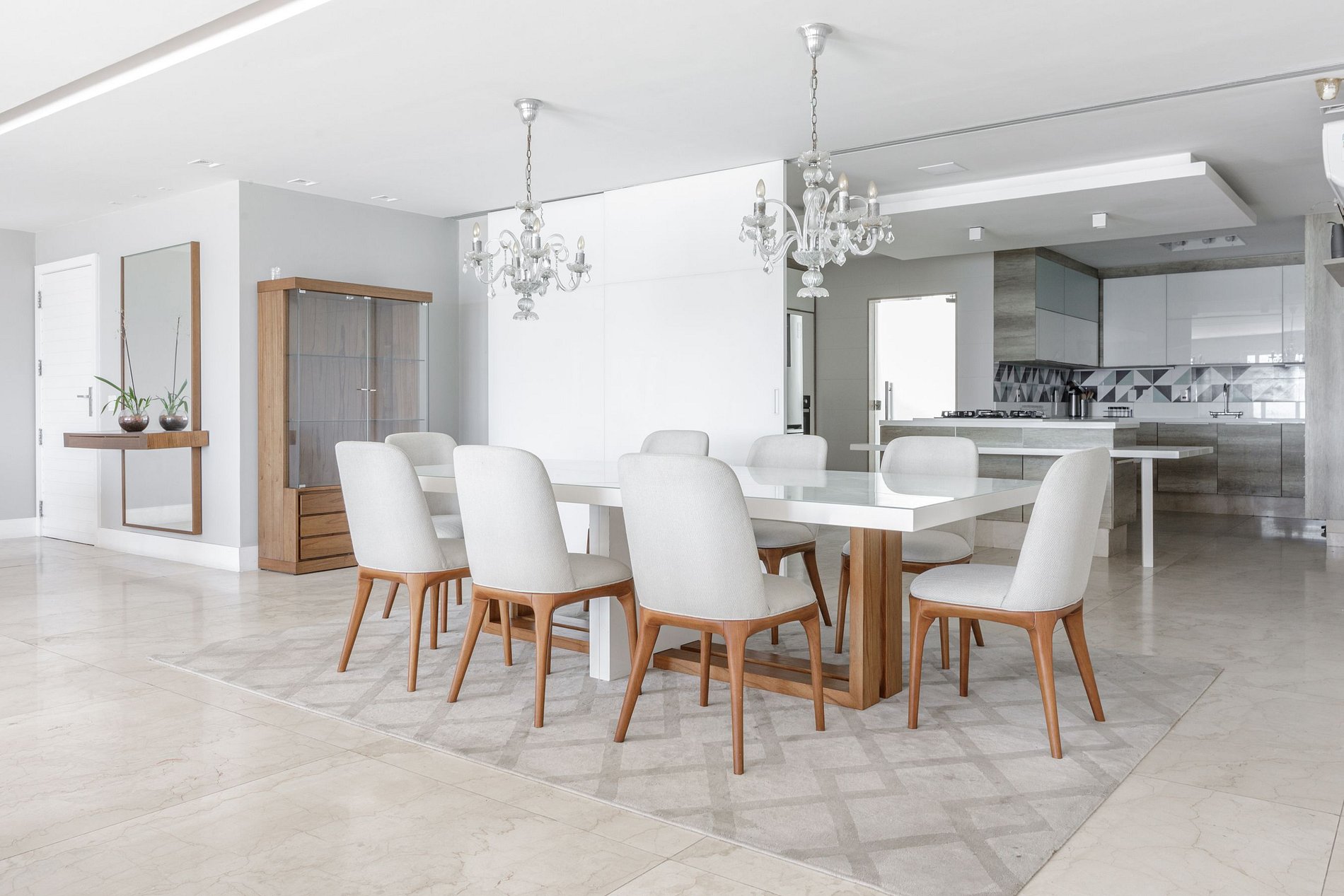 The social area is a spectacle in itself, with two distinct living rooms. One, on the upper floor, opens onto the terrace with the swimming pool, while the other, on the lower floor, harmoniously joins the second terrace and the dining room. The dining room, with a movable wall that separates the open-plan kitchen, provides flexibility and style.