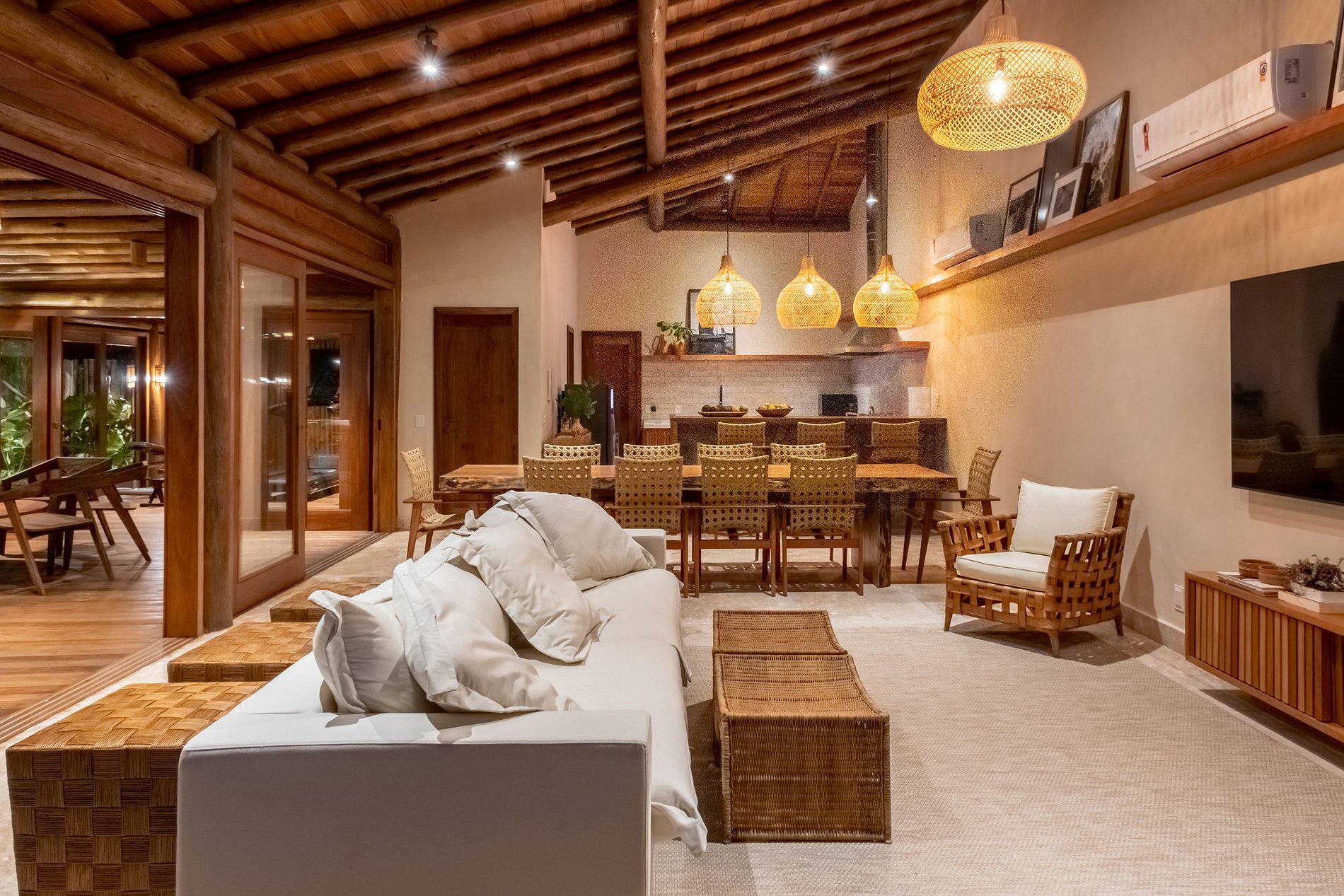 The main core of the house features a comfortable living room with a 65-inch TV, a toilet and an American kitchen complete with a gas cooktop, refrigerator, air-conditioned wine cellar and four suites, all equipped with high-pressure gas showers, queen beds size, air conditioning and dresser. Of these, two suites have spacious bathrooms with two showers.