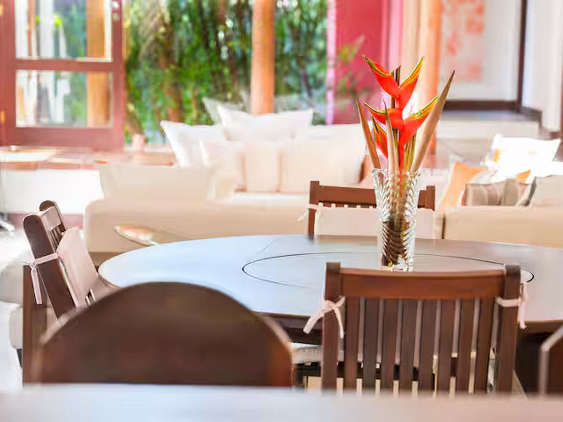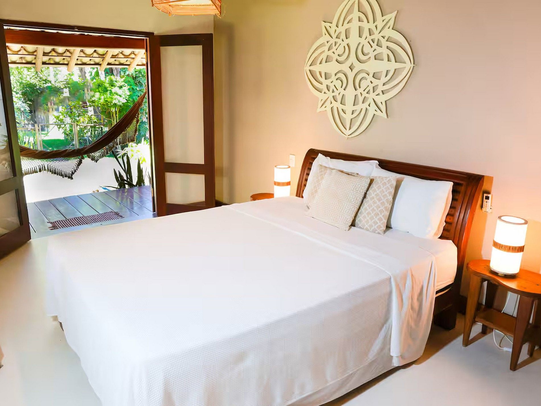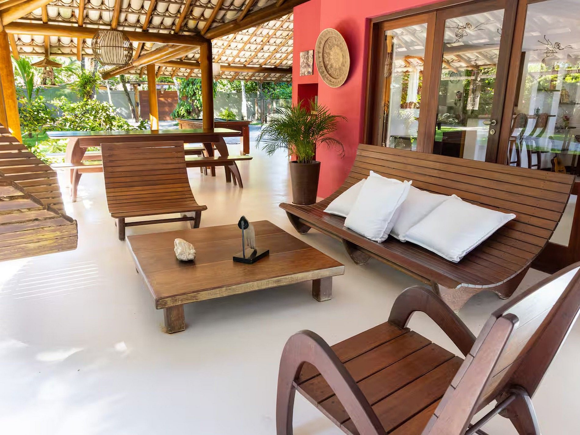 На открытом воздухе особое внимание привлекает большой бассейн, окружённый удобными шезлонгами, где можно понежиться на солнце и отдохнуть. Зеленый сад с цветочными клумбами создаёт атмосферу покоя и умиротворения. Просторная веранда с диванами и деревянными гамаками приглашает любоваться характерными закатами на побережье Баии. Для тех, кто предпочитает поддерживать форму даже во время отпуска, предусмотрен полностью оборудованный тренажёрный зал.