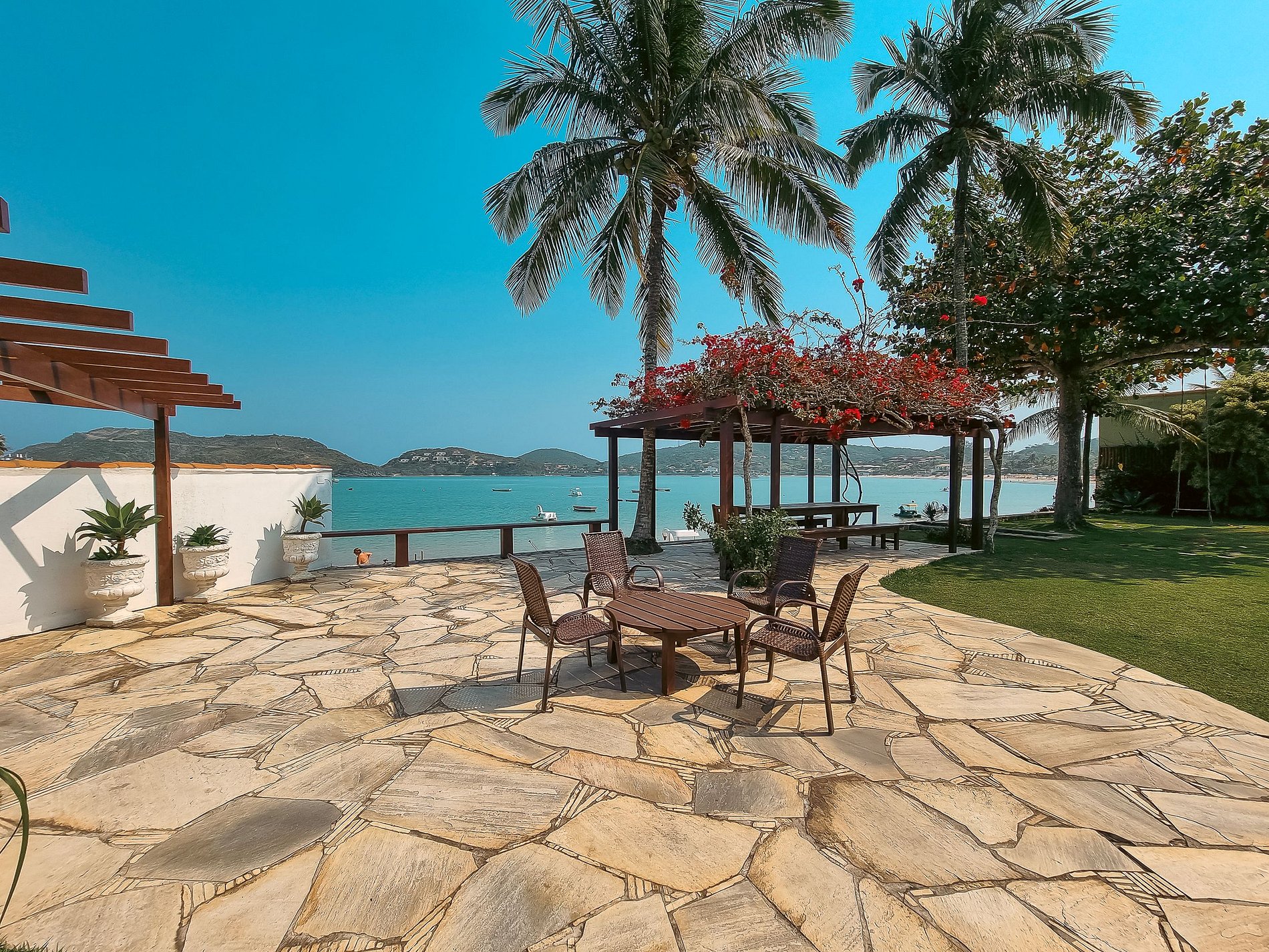 From its internal area, with air-conditioned suites, a fully equipped kitchen, bar and rooms integrated to its exterior with a swimming pool, sauna, shower, and gourmet area. The jewel of the house is the charming flowered pergola, almost “on the sand”, where it is possible to have meetings and meals in the open air framed by the paradisiacal blue of the Ferradura sea.
