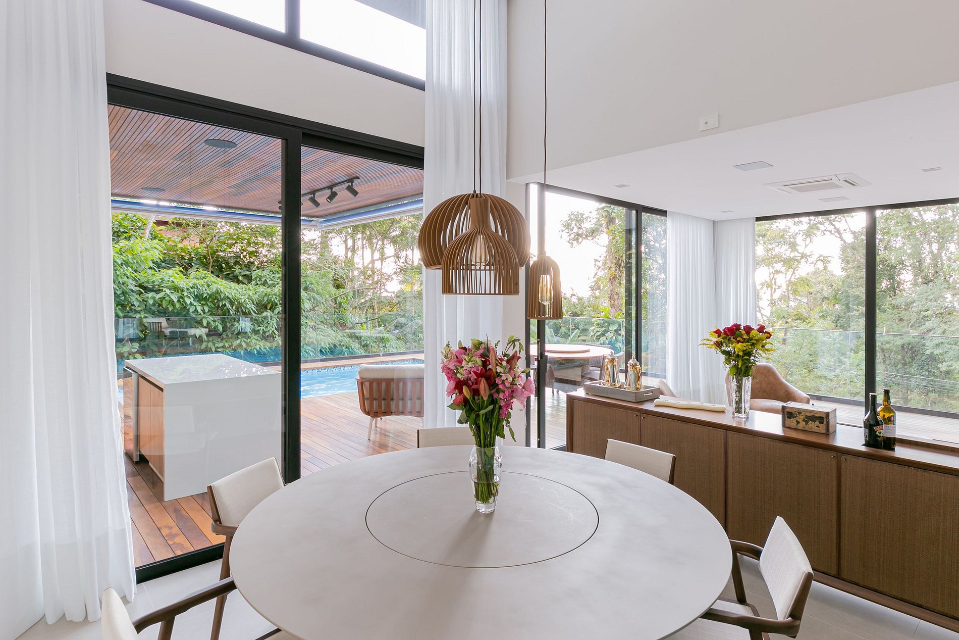 Located in a quiet and safe region of Guarujá, this house is a true haven of tranquility. With a modern and bold architecture, the house stands out in the midst of the green natural surroundings, creating a harmonious contrast that is pleasing to the eye.